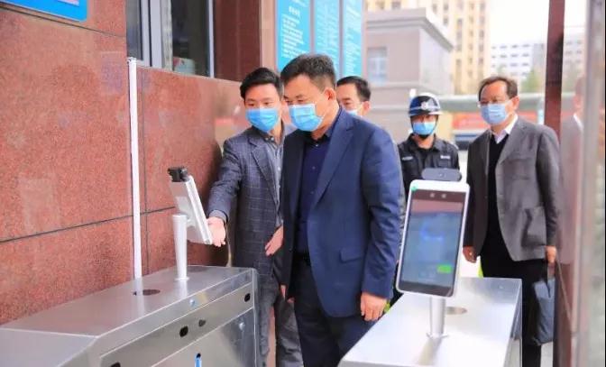 督查小組在視察入校體溫檢測點(diǎn)后,了解到智能測溫設(shè)備可通過在相關(guān)區(qū)域出入口部署人體測溫閘機(jī),實(shí)現(xiàn)體溫篩查與人臉識別雙重認(rèn)證通行,最大可能避免外來人員進(jìn)入先關(guān)區(qū)域,確保在疫情期間既不疏于疫情防控,也不漏學(xué)生安全防護(hù)。技術(shù)人員為陜西省教育廳副廳長王紫貴介紹智能體溫測量系統(tǒng)