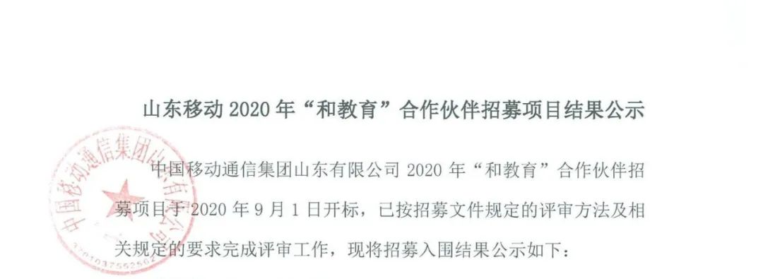 2020年9月7日,我公司在山東移動(dòng)“和教育”合作伙伴招募項(xiàng)目中,憑借過(guò)硬的產(chǎn)品質(zhì)量,扎實(shí)高效的工作作風(fēng),卓越的運(yùn)作團(tuán)隊(duì)和良好的商業(yè)信譽(yù),順利入圍。